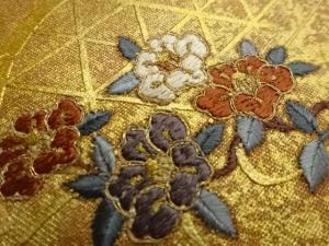 金彩蛇籠に梅・紅葉・花々模様刺繍名古屋帯