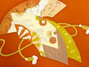 塩瀬引箔手描き地紙に短歌・片輪車・組紐模様名古屋帯