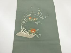 塩瀬金彩金駒刺繍椿に枝葉模様名古屋帯