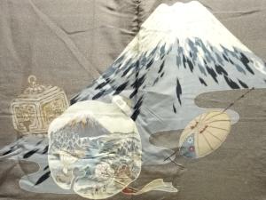 アンティーク 富士に田舎風景模様肩裏本場村山泥大島紬男物羽織