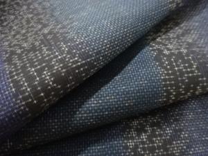 洗練された落ち着きのある色合いで、生地そのものは柔らかく、しわになりにくいと言われている。大島紬の特徴とも言える、織締めと呼ばれる技法で藍を用いて染められた糸を使用している。