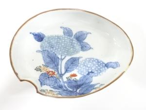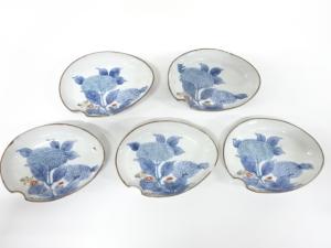 藍九谷 染付色絵 紫陽花文様 変形皿 5客