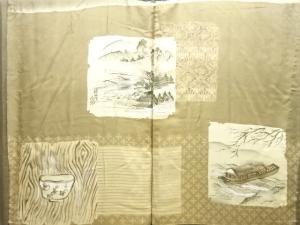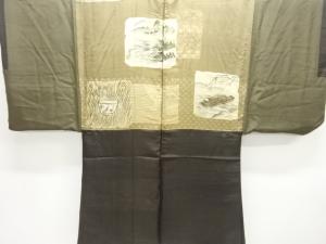 アンティーク 破れ色紙に屋敷風景模様肩裏紋付羽二重男物羽織