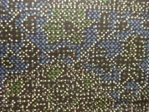 洗練された落ち着きのある色合いで、生地そのものは柔らかく、しわになりにくいと言われている。大島紬の特徴とも言える、織締めと呼ばれる技法で藍を用いて染められた糸を使用している。
