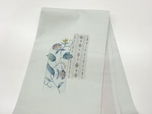手織り紬手描き花唐草に抽象縞模様開き名古屋帯(額縁仕立て)
