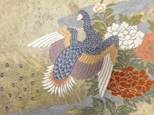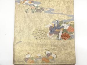 引箔 鴛鴦に孔雀・流水模様織り出し 袋帯
