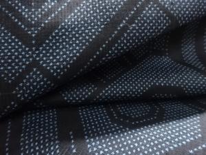 洗練された落ち着きのある色合いで、生地そのものは柔らかく、しわになりにくいと言われている。大島紬の特徴とも言える、織締めと呼ばれる技法で藍を用いて染められた糸を使用している。