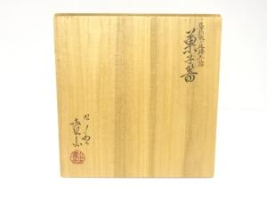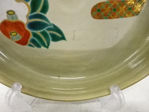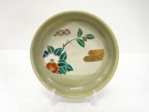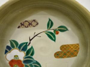 九谷焼 上出喜山造 極彩色小紋椿文様 菓子器