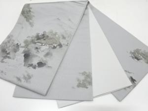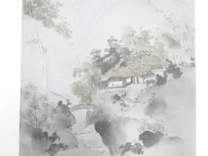 アンティーク 手描き 山里風景に釣り人模様袋帯(材料)