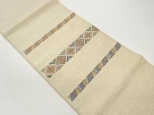 横段に菱・鳥・幾何学模様織出し開き名古屋帯(額縁仕立て)