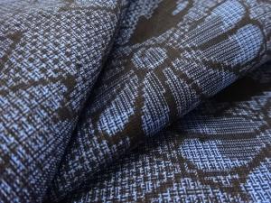 洗練された落ち着きのある色合いで、生地そのものは柔らかく、しわになりにくいと言われている。大島紬の特徴とも言える、織締めと呼ばれる技法で藍を用いて染められた糸を使用している。