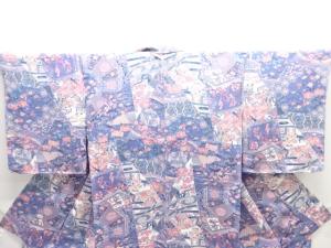 未使用品 仕立て上がり 縮緬地 裂取りに草花・時代人物模様小紋着物